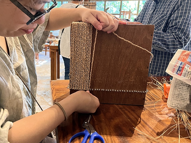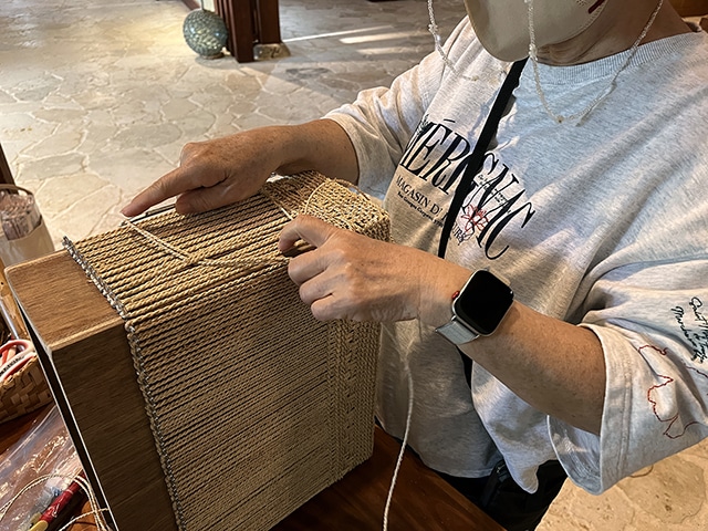 縦の縄をかけ、いよいよ編み始めていきます。